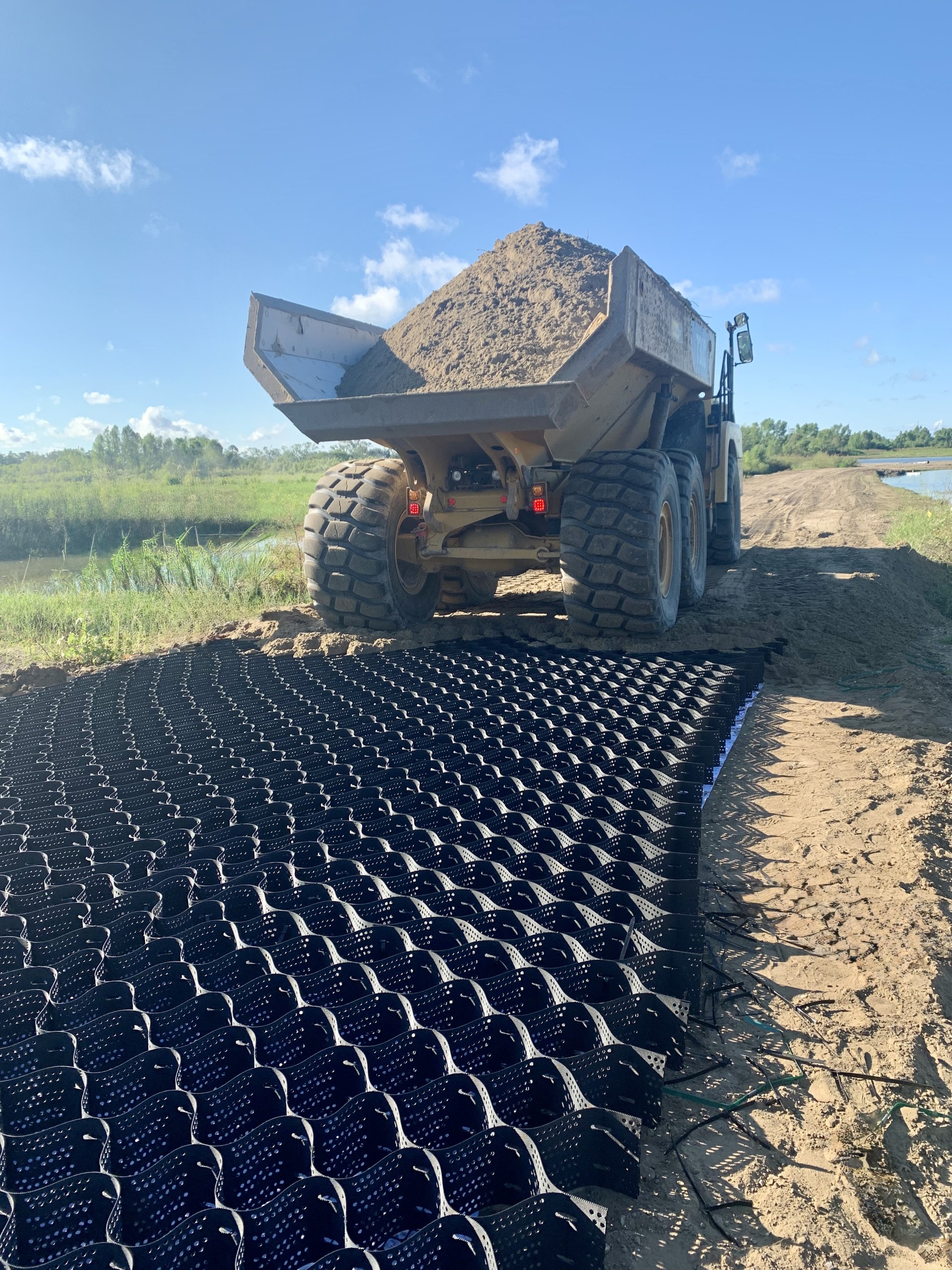 We recommend GeoCells for haul roads, highways, laydown yards, railbeds, and heavy load stabilization projects. This allows for construction over poor soils. GeoCells also reduce base layer requirements and extend pavement service life.