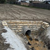 Jefferson Parish was able to successfully install a 96' section of RCR-12® to stabilize a channel primarily used for drainage. Water levels fluctuate weekly, causing erosion that compromises the slope. The beginning and termination of the ditch tie into a 4' concrete culvert, which was easily transitioned using Reinforced Concrete Roll® and traditional poured concrete. Concrete bags were used in a "bag wall" method to provide erosion control, support, and a smooth transition between the material and the existing concrete pipe. The RCR® provided slope stability against the low CBR and soft clays.